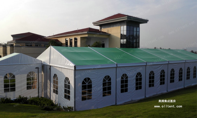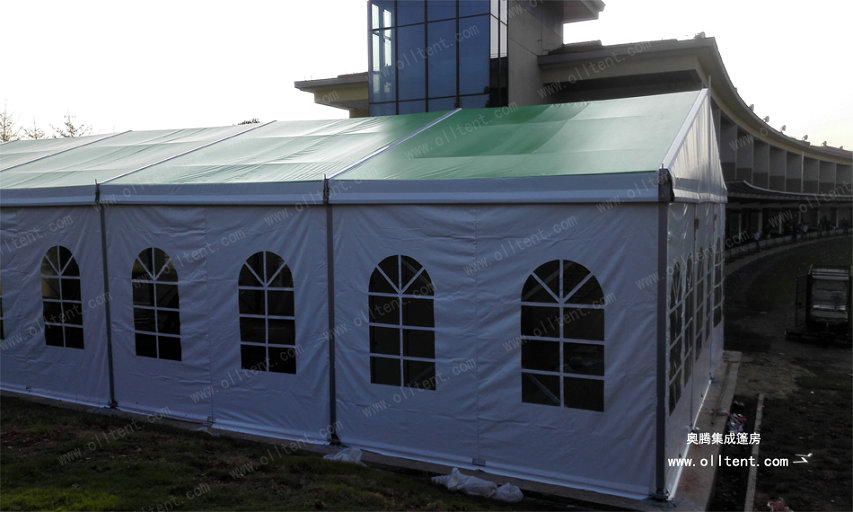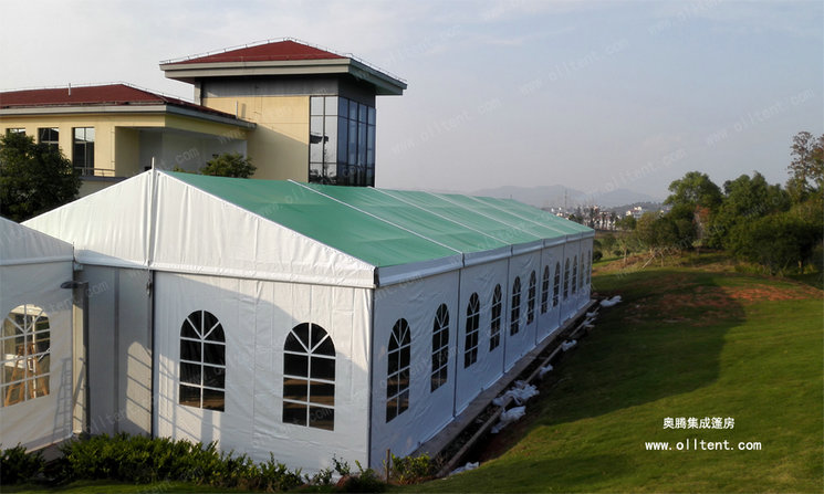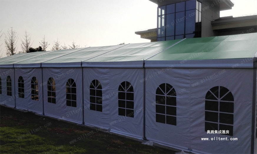 JX系列小型篷房常規(guī)寬度是6米、9米、12米、15米共四種常用尺寸。篷檐高度(邊高)是3米。篷房的結(jié)構(gòu)采用單元組合式設(shè)計(jì),長(zhǎng)度可按3米間距增加或減少。支架的主要構(gòu)件(立柱和斜梁)用四槽的122×68×3㎜四槽的高強(qiáng)度氧化鋁合金管材制造,篷布采用阻燃的雙面PVC刀刮布,符合歐洲DIN4102B1、M2標(biāo)準(zhǔn)。克重650、750、850克/平方米,有遮光和半透光兩種篷布選擇,篷房同樣可以配套ABS墻體、三明治墻體、彩鋼瓦墻體、玻璃幕墻、排水槽等豐富的配置,滿足各種功能需要。