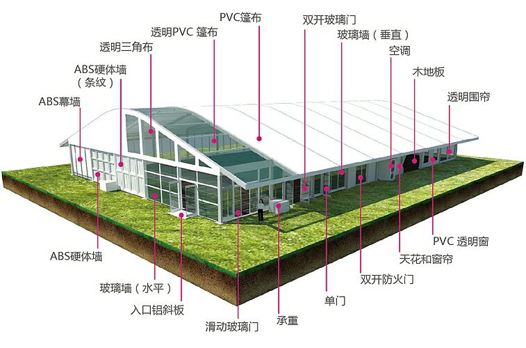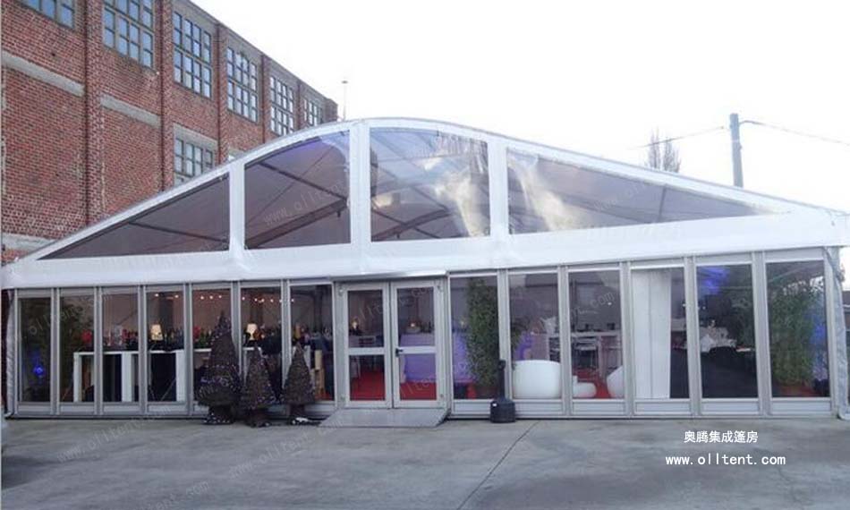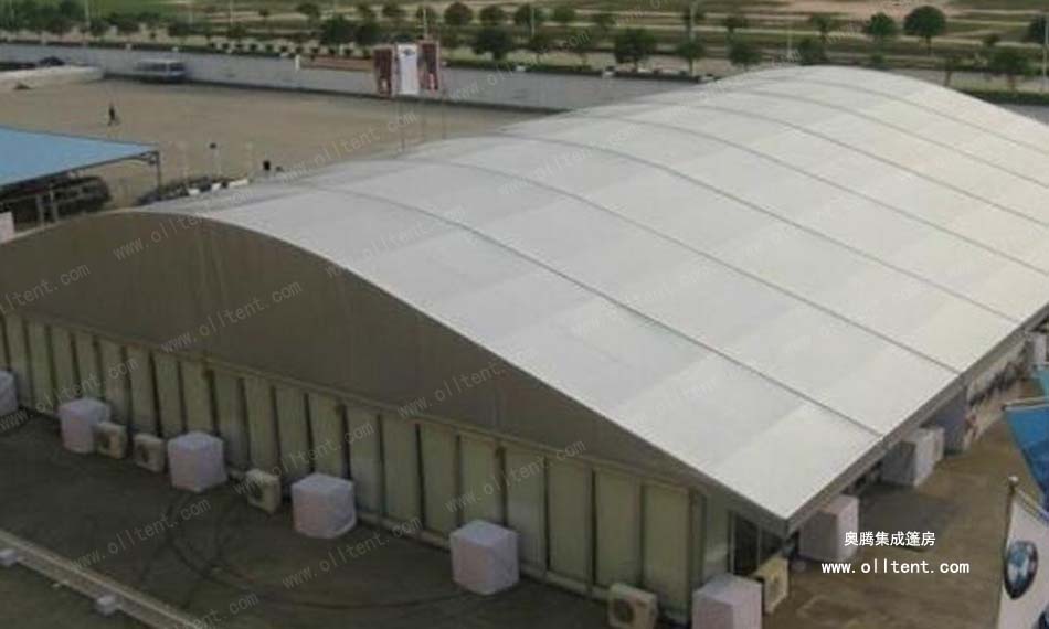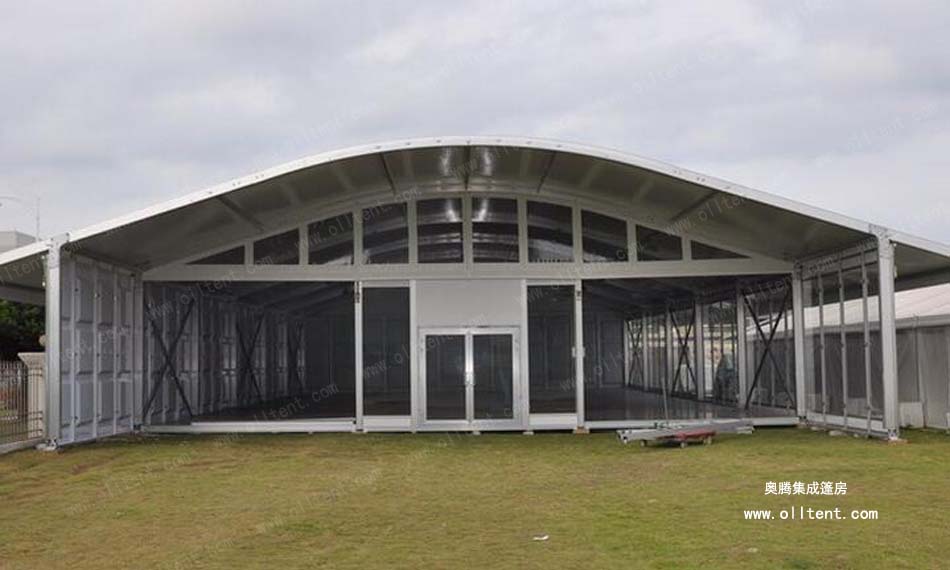 弧頂篷房有多種可供選項購的配置,其功能和用途更為強大。例如:ABS墻體、三明治墻體、彩鋼瓦墻體、玻璃幕墻、透明頂、頂幔布幔內(nèi)飾、排風扇、卷簾門、玻璃門、承重盤承重框、地板系統(tǒng)、排水槽等