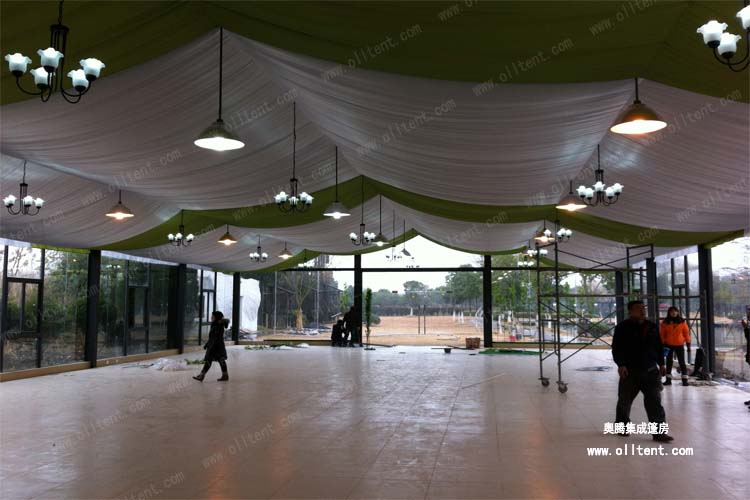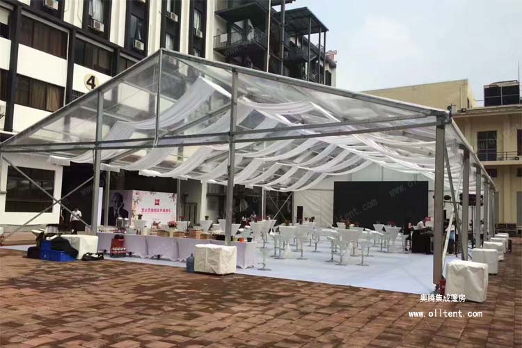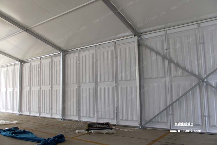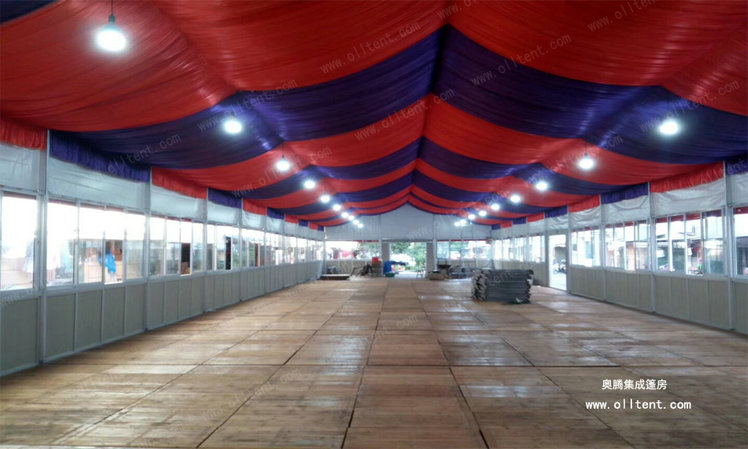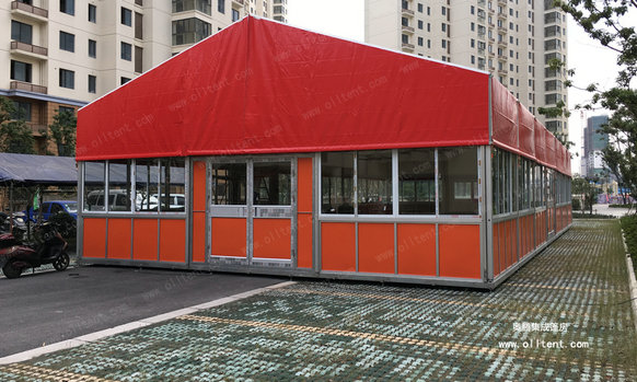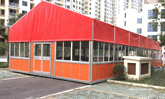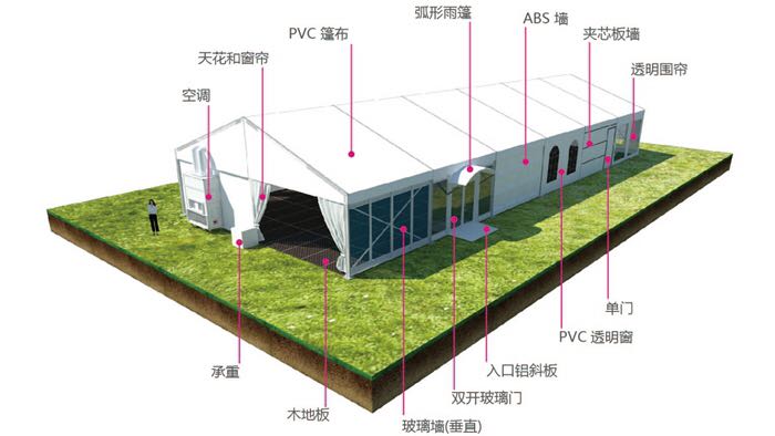 CQ系列小型篷房常規(guī)寬度是6米、9米、12米、15米共四種常用尺寸。篷檐高度(邊高)是3米。篷房的結(jié)構(gòu)采用單元組合式設(shè)計,長度可按3米間距增加或減少。支架的主要構(gòu)件(立柱和斜梁)用四槽的122×68×3㎜四槽的高強度氧化鋁合金管材制造,篷布采用阻燃的雙面PVC刀刮布,符合歐洲DIN4102B1、M2標(biāo)準(zhǔn)。克重650、750、850克/平方米,有遮光和半透光兩種篷布選擇,篷房同樣可以配套ABS墻體、三明治墻體、彩鋼瓦墻體、玻璃幕墻、排水槽等豐富的配置,滿足各種功能需要。