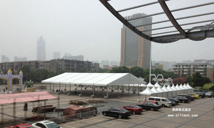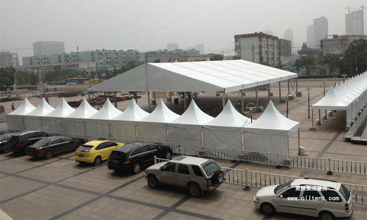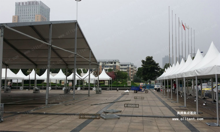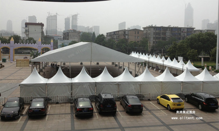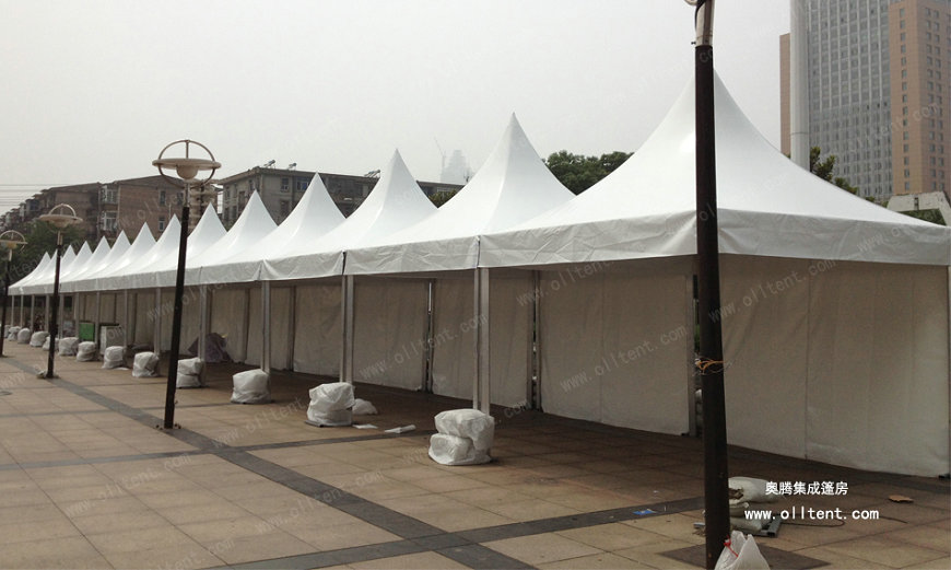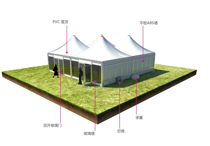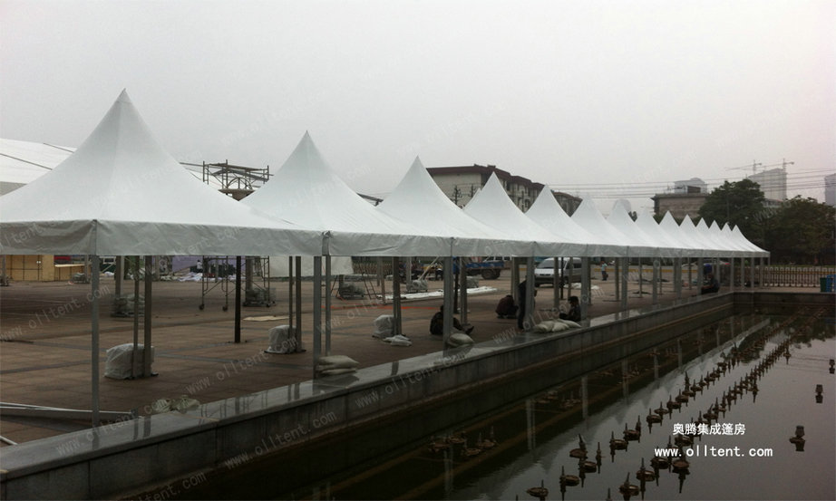 尖頂篷房?jī)?yōu)雅,堅(jiān)固,潮流,搭建工期短,易于組裝和拆卸。新錐頂篷固定方式,已獲得設(shè)計(jì)專利證書,新的固定方式,不但大大減少了組裝時(shí)間,很好的防止滑出。無需大型機(jī)械協(xié)助,單個(gè)也可用排水槽連接起來組成更大的面積,形成特殊的造型。